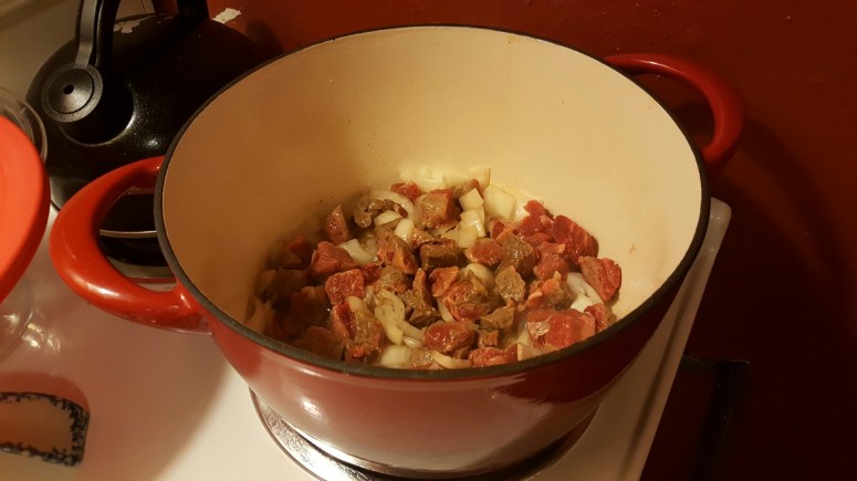 - Place oil in a cast iron dutch oven or large soup pot. Add meat & onions. Cook uncovered, stirring occasionally, until browned. The meat will stick a bit but that’s totally OK. When you add the liquid later, scrape the bottom of that pot to get all the yummy bits – that’s what adds flavor!