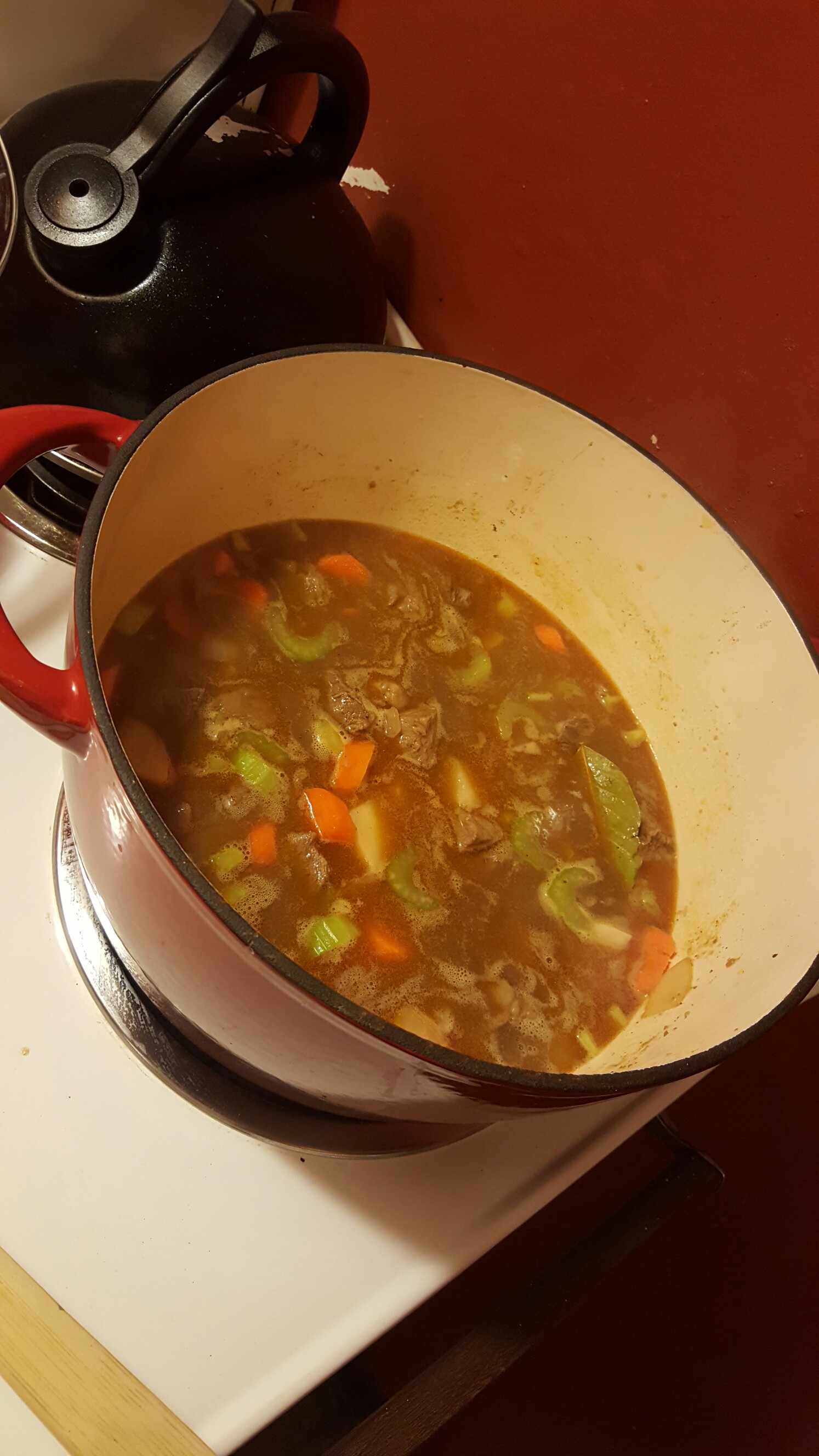 - Add celery, carrots, potatoes, paprika & bay leaves.